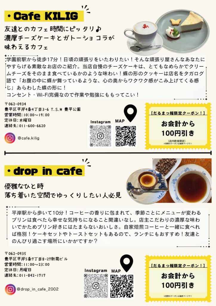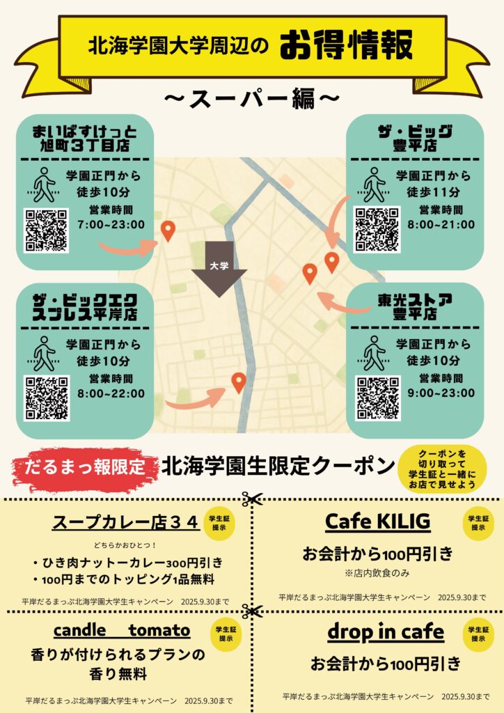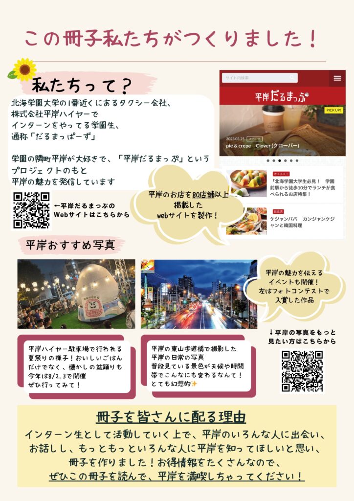 北海学園大学のインターン生による成果物。北海学園大学が豊平、平岸エリアにありながら大学生がこのエリアのことを知らずに日々を過ごしていることに勿体無さを感じ、企画。